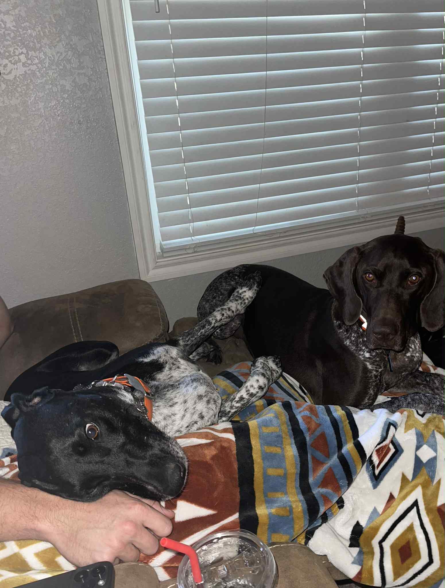 She’s a bit protective of her food, so separate feeding times or spaces are best, and she could benefit from training on basic commands — she’s eager to please but likely was never taught any commands prior to coming into the rescue. She responds well to an e-collar (only using the tone, no vibrate or shocking necessary). She will always let you know when someone is at your door or in your house, and although she might have a mean bark, she has ZERO bite and will only attack people with love and affection.