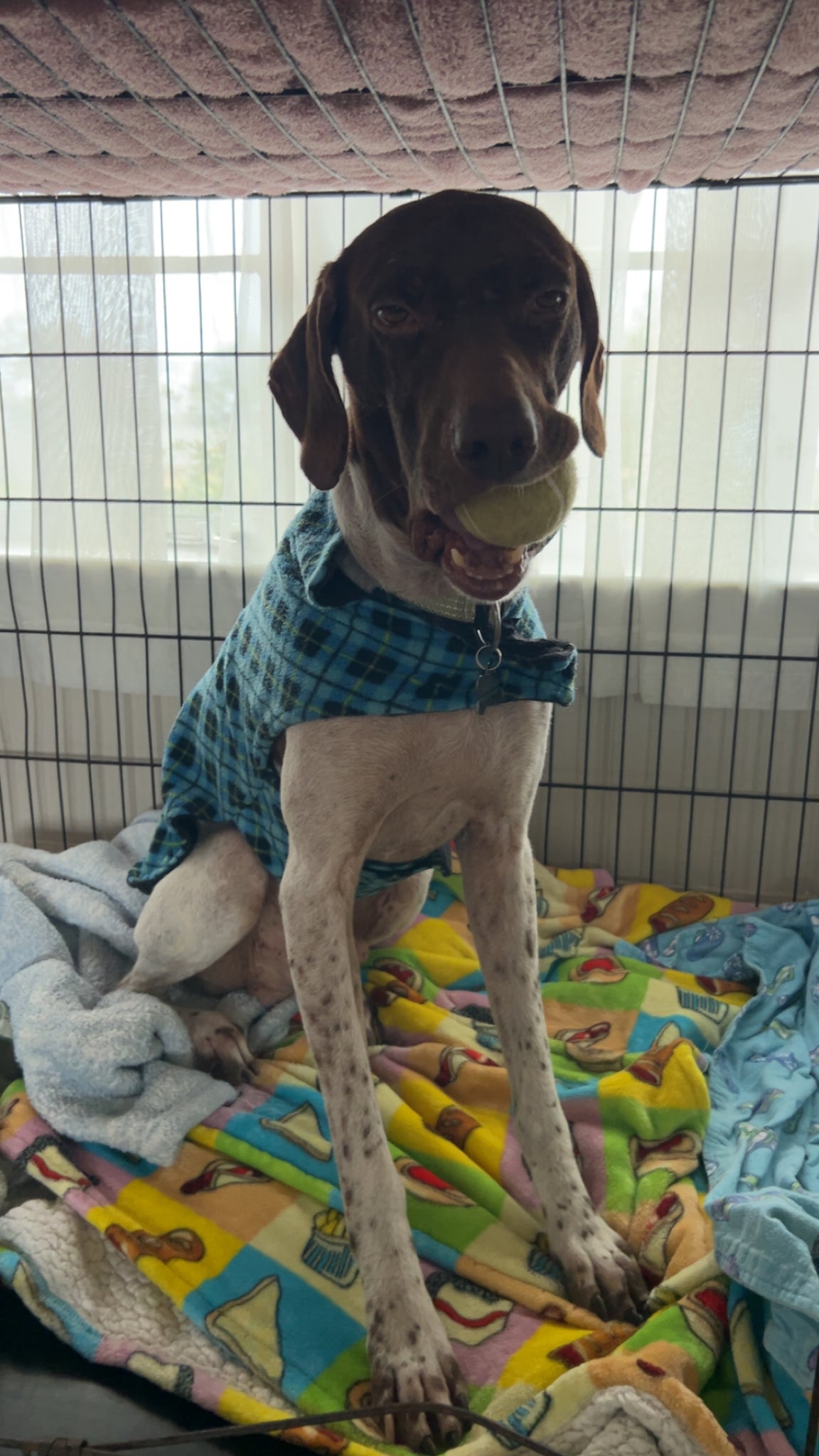 Woody is crate trained—He goes to his crate happily & will even hang out there during the day. He will sleep thru the night in it with no accidents.